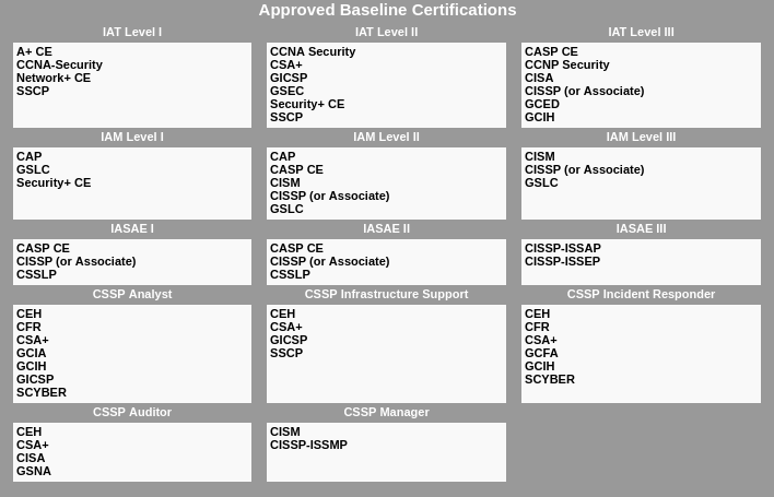 In addition, CSSP or CyberSecurity Service Provider comes in five varieties with somewhat different certification requirements.